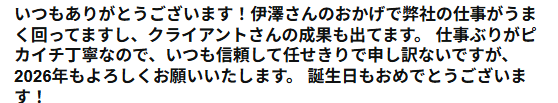 その他にも、SEO記事では「過去1の記事納品クオリティ」「素晴らしい出来」「伊澤さん以外に任せられる人がいない」と、ありがたいご評価をいただいております。